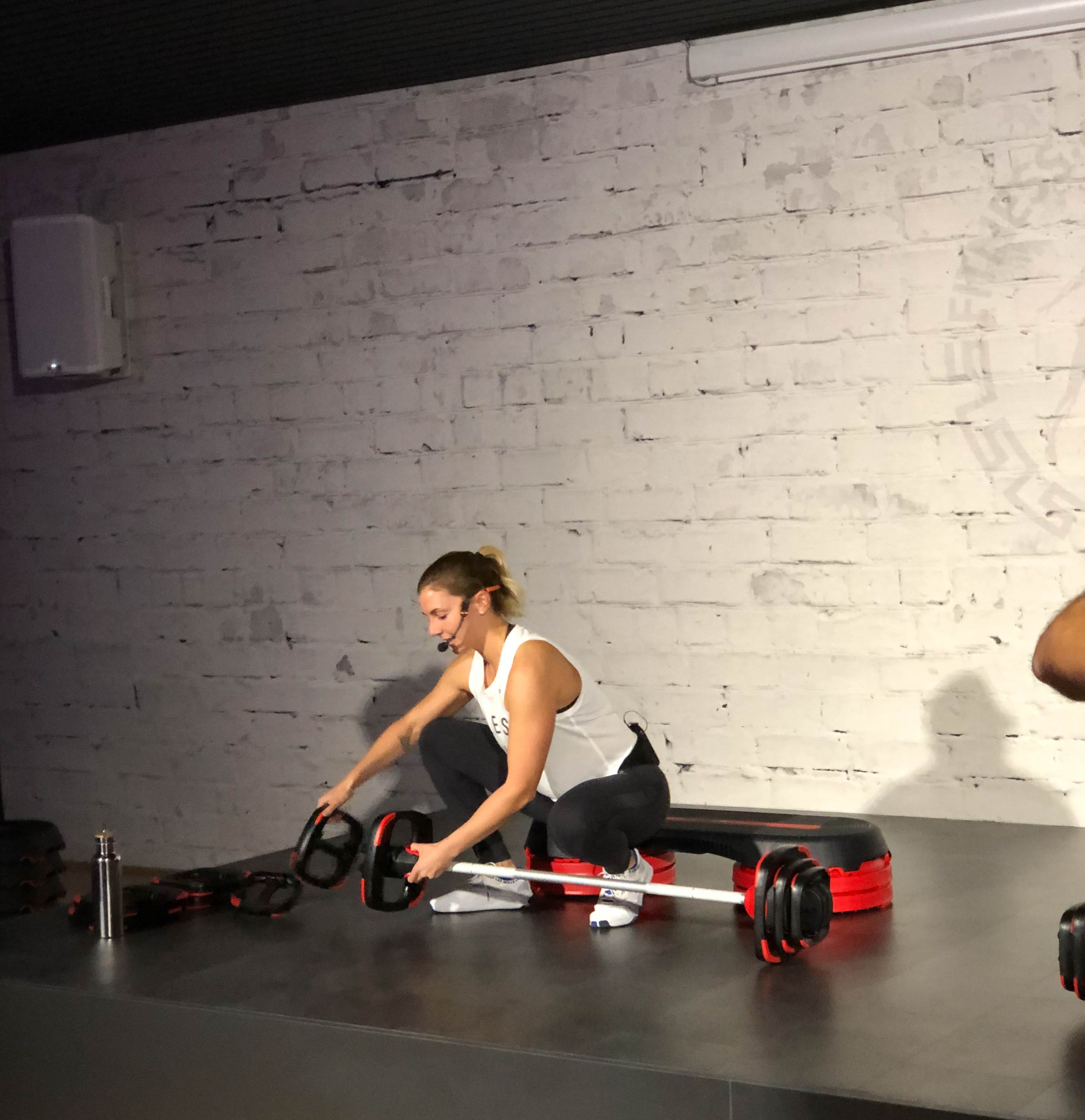 Ein paar Monate später ist der Raum des Studios, das 1975 von der Familie Röhrle gegründet wurde, kaum wiederzuerkennen. Durch die Kooperationen zwischen LES MILLS, dem Wandgestalter JuicyWalls, dem Licht- und Ton-Partner SOTA, der sich auf die Ausstattung für Fitnessstudios spezialisiert hat sowie Famoso, der Objekteinrichter in der Fitnessbranche für intelligente Einrichtung, konnte der Kursraum regelrecht neu erfunden werden. Die Spiegel sind einer schicken Steinwand gewichen, das alte Equipment wurde durch SMART TECH Equipment, das platzsparend auf Racks platziert ist, ersetzt, das Logo des Studios ziert dezent die Wand des Raumes, die Bühne hat einen Feinschliff erhalten und bietet nun mehr Platz zum Unterrichten und auch Musik- und Lichteffekte haben ein ordentliches Upgrade erhalten. All das hat den Kursraum in eine echte Erlebniswelt verwandelt, die jeden Teilnehmer ab Betreten des Raumes begeistert.