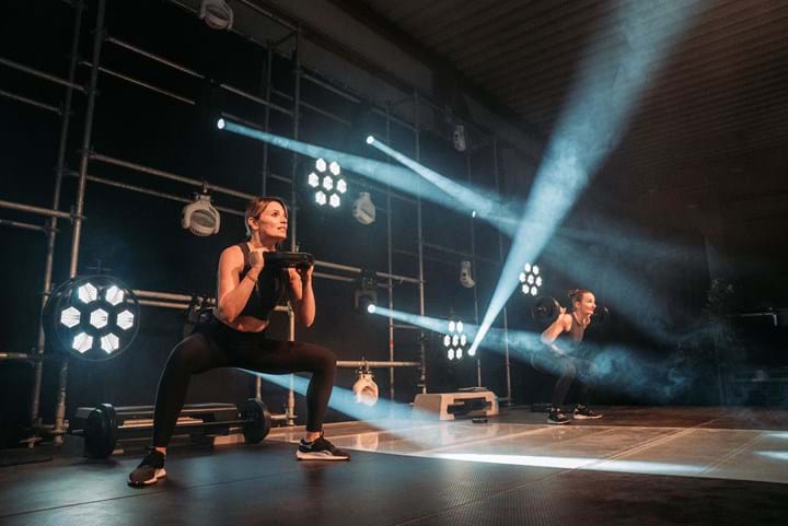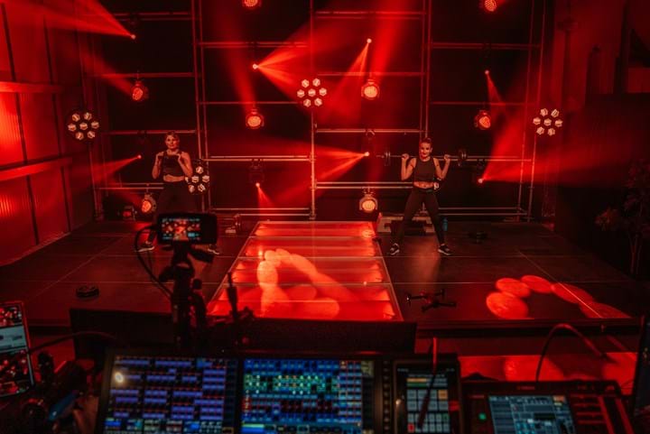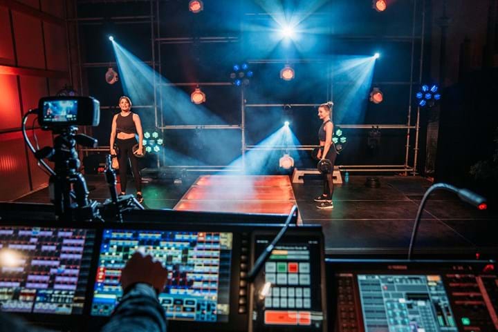 Mit 50 Metern Traverse, 1.000 Metern Kabel, 15 Kilowatt Leistung, 6 verschiedenen Kameras, 40 Lampen für die optimale Beleuchtung und 2 Technikern pro Livestream kreierte das Duo ein unvergessliches Mitgliedererlebnis, das einer Live Class in kaum etwas nachsteht.