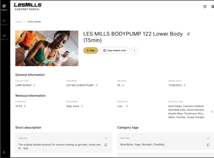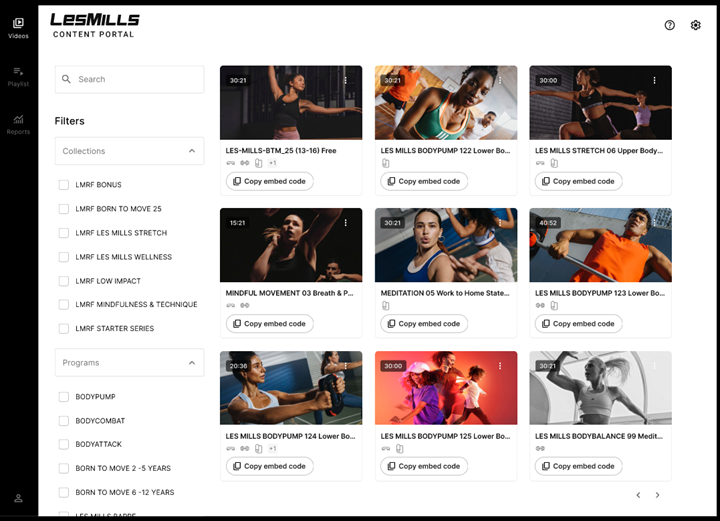 Das bedeutet, dass Les Mills Content Partner nicht mehr alle Videodateien der vierteljährlichen Releases einzeln herunter- und manuell wieder hochladen müssen. Je nach gewählter Methode (API, eingebetteter Webplayer, Video-Embed-Codes) richten die Partner ihre Bereitstellungsmethode einmal ein und müssen die Inhalte dann nur noch jedes Quartal über die gewählte Ingestion-Methode aktualisieren. Alle Änderungen, die im Content Portal vorgenommen werden (wie z.B. die Änderung von Wiedergabelisten), werden auf der Grundlage der jeweiligen Ingestion-Methode übernommen.