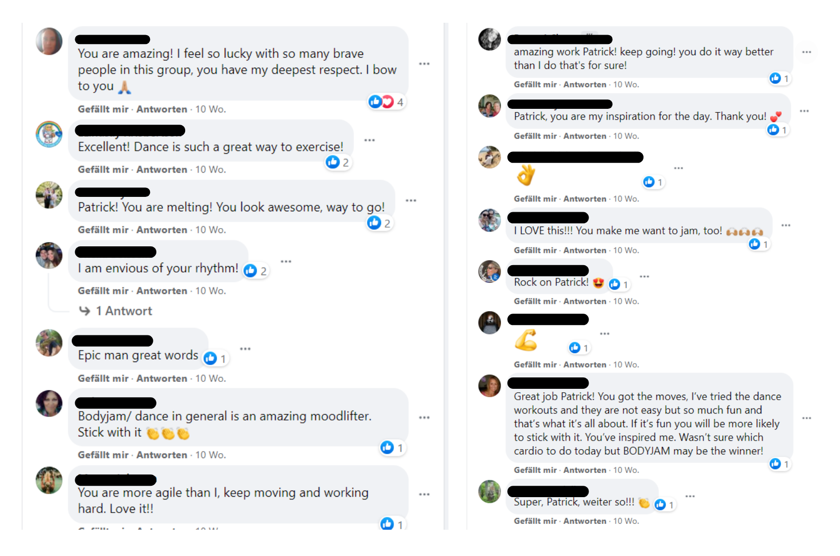 Auch die Instruktorinnen des Fitnesscamp Westerwald sind begeistert und inspiriert von Patricks Entwicklung: „Patrick hat sich so sensationell entwickelt. Man konnte bei ihm immer den Spaß spüren, denn er ist ganz offen an alles herangegangen. Wir staunen immer wieder, wie beweglich er geworden ist. Er ist ein fester Bestandteil unserer Classes und wir freuen uns sehr darüber, ihn dabei zu haben – egal ob live oder per Livestream.“